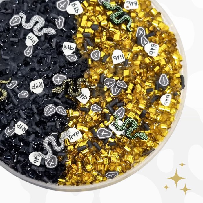Reputation is a black & gold full bingsu slime topped with tombstones, snakes and black sprinkles. It is scented with a black raspberry & vanilla scent.